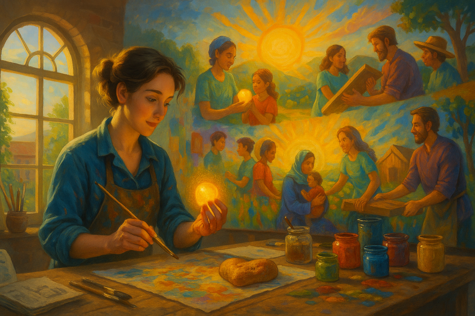 Lena’s bead, now embedded in the soil of her farm, is eventually unearthed by a young artist named Vera, who is searching for new inspiration. Vera has been struggling with a creative block, unsure of how to begin her next painting. As she holds the bead, she feels the ground beneath her feet stir with energy. The bead seems to whisper of connection—of how each of her strokes on the canvas is part of a larger story. With newfound inspiration, Vera begins a mural for the local community center, depicting scenes of connection and unity. She places the bead inside the paint, letting it dry into the mural’s vibrant colors, a permanent part of the artwork.